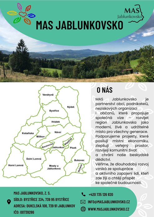 Součástí brožury jsou také kontakty na tým MAS Jablunkovsko a základní údaje o tom, jak se do spolupráce zapojit. Brožura slouží jako orientační průvodce – a první krok pro ty, kteří chtějí v regionu něco posunout dopředu.