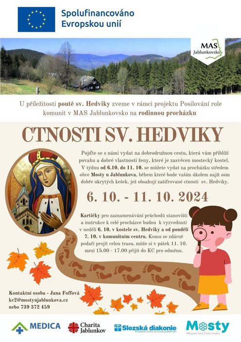 Po loňském úspěchu akce "Po stopách sv. Hedviky" pro vás i na letošní předpouťový týden v Mostech u Jablunkova chystáme rodinnou procházku středem obce spojenou s hledáním kešek, letos na téma "Ctnosti sv. Hedviky". Vaším úkolem bude najít osm dobře ukrytých schránek a rozluštit osm zašifrovaných dobrých Hedvičiných vlastností. Komu se podaří zdárně projít celou trasu a zvládnout vyřešit všechny šifry, na toho v závěru týdne čeká odměna. Více informací o celé akci viz přiložený leták ![]()