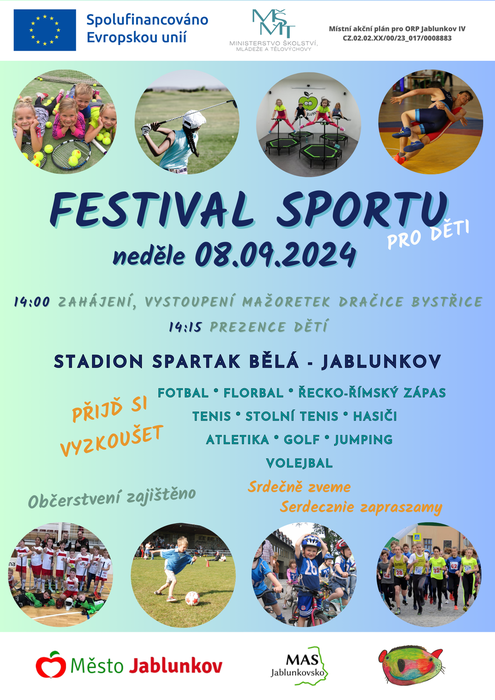 Zveme všechny malé sportovce i jejich rodiče na Festival sportu, který se uskuteční v neděli 8.9.2024 od 14:00 hodin na stadionu Spartak Bělá v Jablunkově!