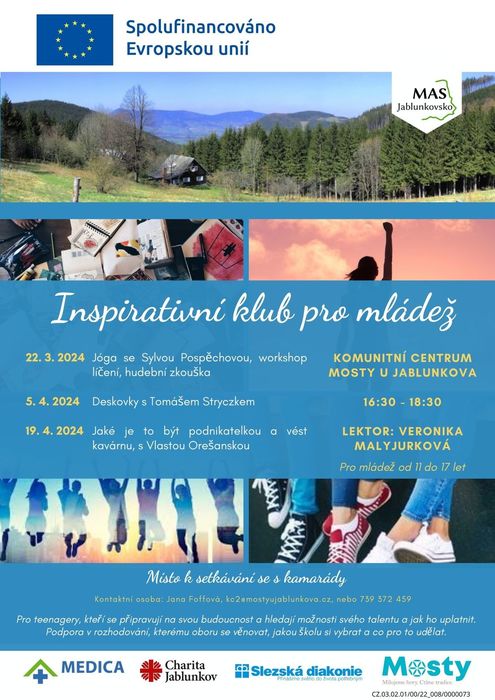 Každý druhý pátek se v prostorách Komunitního centra v Mostech u Jablunkova schází Inspirativní klub pro mládež. Teenageři mají pod vedením lektorky Veronika Manit Malyjurkova možnost odhalit a prozkoumat své talenty a hledat cesty, kterými by se mohli třeba v profesním životě ubírat. Na letáčku uvádíme program na nejbližší setkání, tak pokud máte doma nebo v blízkém okolí nějakého dospívajícího, nasměrujte ho některý pátek na toto přínosné setkání ![]()