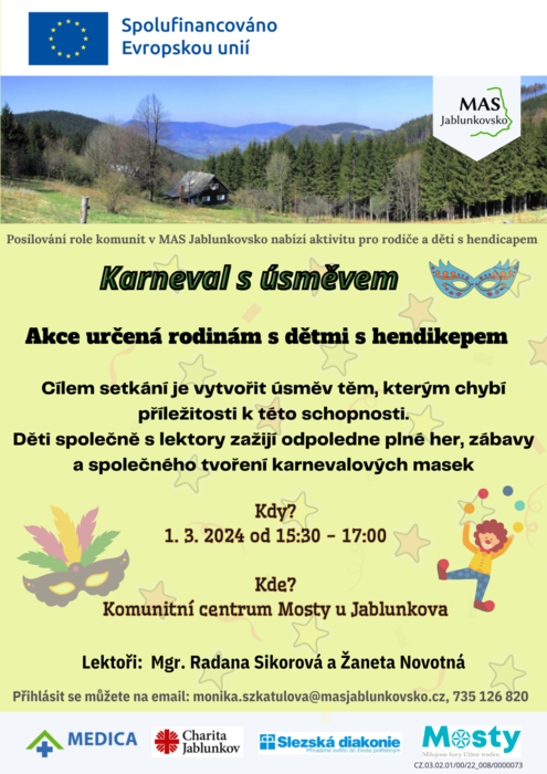 Pro rodiny s dětmi s hendikepem jsme připravili akci "Karneval s úsměvem". Pokud máte o tuto aktivitu zájem prosím kontaktujte osobu uvedenou na letáku.