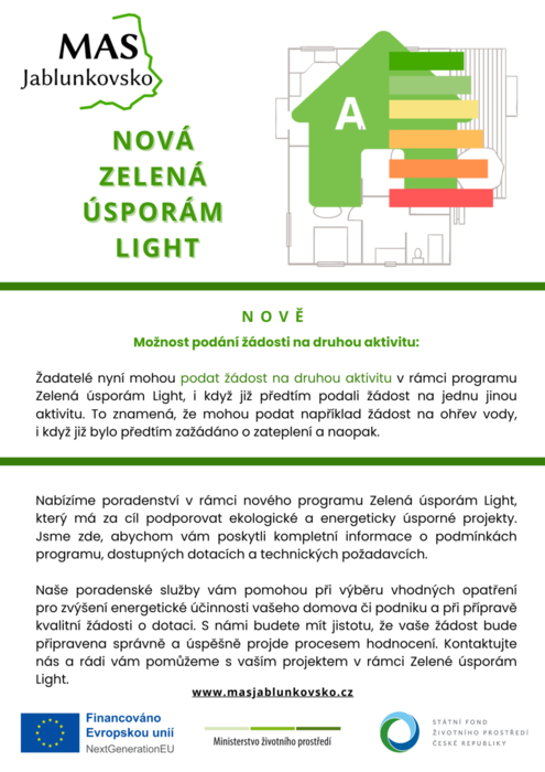 Nově nyní mohou žadatelé podat žádost na druhou aktivitu v rámci programu Zelená úsporám Light, i když již předtím podali žádost na jednu jinou aktivitu. To znamená, že mohou podat například žádost na ohřev vody, i když již bylo předtím zažádáno o zateplení a naopak.