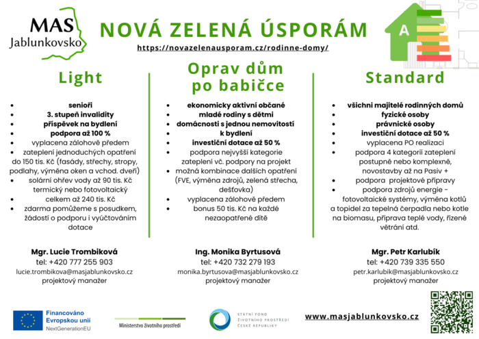 Vážení spoluobčané, nyní jsou ze Státního fondu životního prostředí dotační možnosti, které řeší zateplování Vašich domovů a s tím spojené šetření výdajů za energie. Jedná se o dotace z programu Nová zelená úsporám – Standard, Light a Oprav dům po babičce.