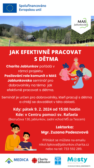 V rámci projektu Posilování role komunit v MAS Jablunkovsko jsme pro Vás připravili seminář s názvem "Jak efektivně pracovat s dětma". Tento seminář je primárně určen dobrovolníkům, kteří pracují s dětmi. Pokud Vás tato problematika zajímá a máte chuť se v této oblasti zapojit, přihlaste se na uvedeném kontaktu.