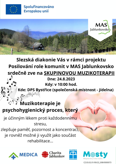 V rámci projektu Vás zveme na další Skupinovou Muzikoterapii v rámci projektu "Posilování role komunit v MAS Jablunkovsko". Setkání se uskuteční v DPS Bystřice od 10:00 hod. Více informací v přiloženém letáku.