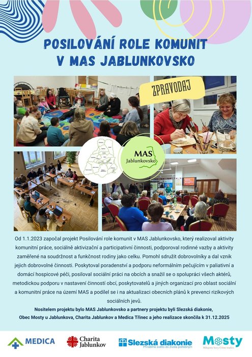 Předkládáme Vám závěrečný zpravodaj projektu Posilování role komunit v MAS Jablunkovsko, který byl realizován v období 1. 1. 2023 – 31. 12. 2025. Projekt se zaměřil na podporu komunitního života, sociální práce v obcích, rodin, seniorů, osob se zdravotním omezením i neformálních pečujících.